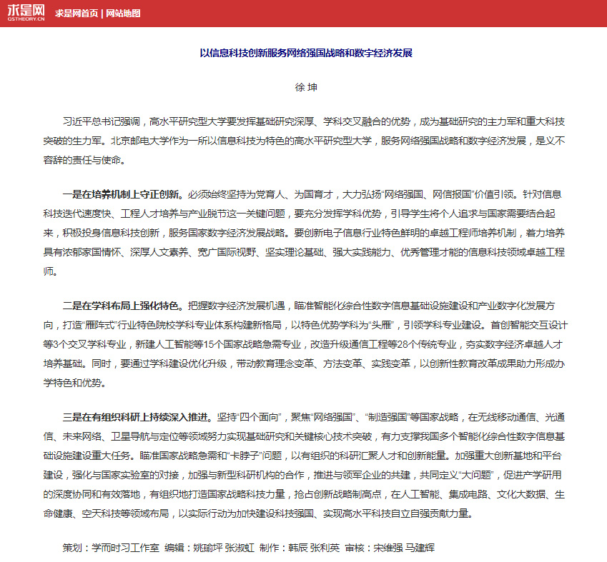 2022年5月12日,求是网刊载文章《求是访谈 | 自觉履行高水平科技自立自强的使命担当》。在文章中,校长徐坤以《以信息科技创新服务网络强国战略和数字经济发展》为题,就深入学习领会习近平总书记关于《加快建设科技强国,实现高水平科技自立自强》的重要讲话,深入学习贯彻党的十八大以来习近平总书记关于科技创新的一系列重要论述,畅谈学习体会。